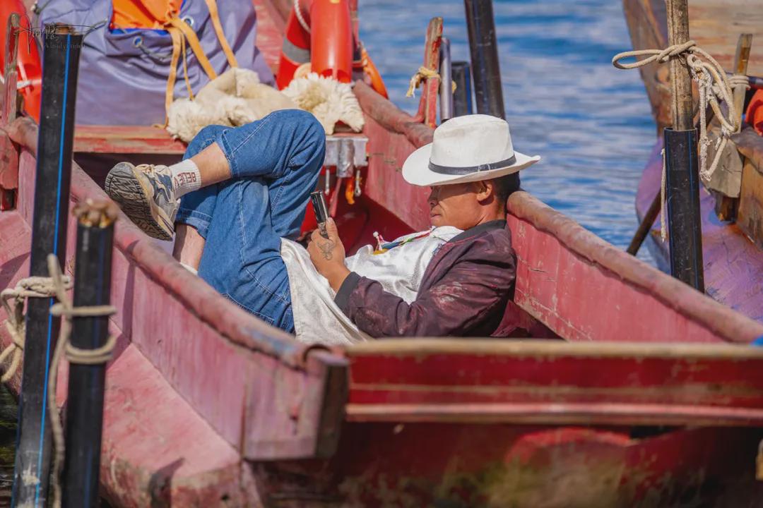 因为我带着长焦镜头,所以记录得比较自由,既有一些船夫在水上安逸休息的场景,也有他们在湖面上执桨往来的画面,但为了避免“肖像权”的麻烦,大部分时候都只抓拍侧脸或者背影(除非镜头里的人物有面巾遮脸或者帽檐低垂),个人感觉在这里玩摄影还是挺容易出片的。