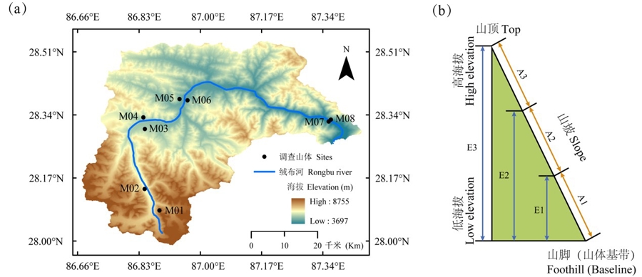 研究区域和调查山体的分布(A)和山体调查区域划分示意图(B)。M01–M08分别表示从绒布河流域从上游到下游所调查的八个山体坡面;A1, A2, A3分别表示将山体根据海拔高度划分的三个海拔段;E1, E2, E3分别表示每个山体所划分的三种调查情景。