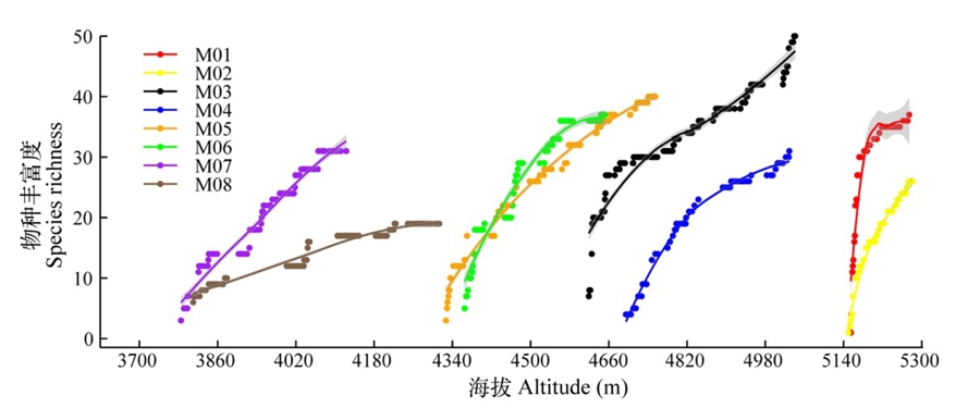 绒布河流域各个山体累计物种丰富度沿海拔高度的变化。M01–M08表示绒布河上游到下游所调查的8个独立山体。